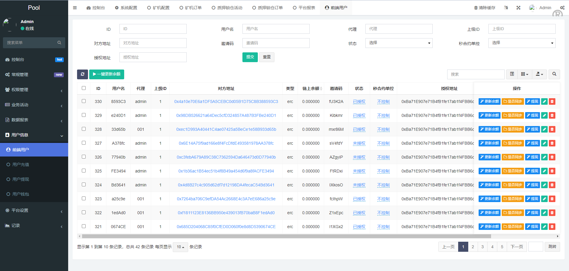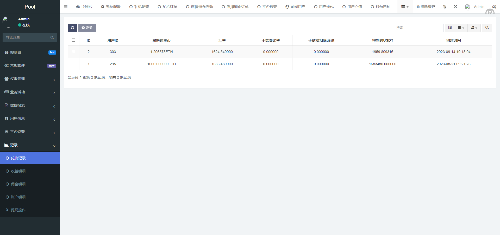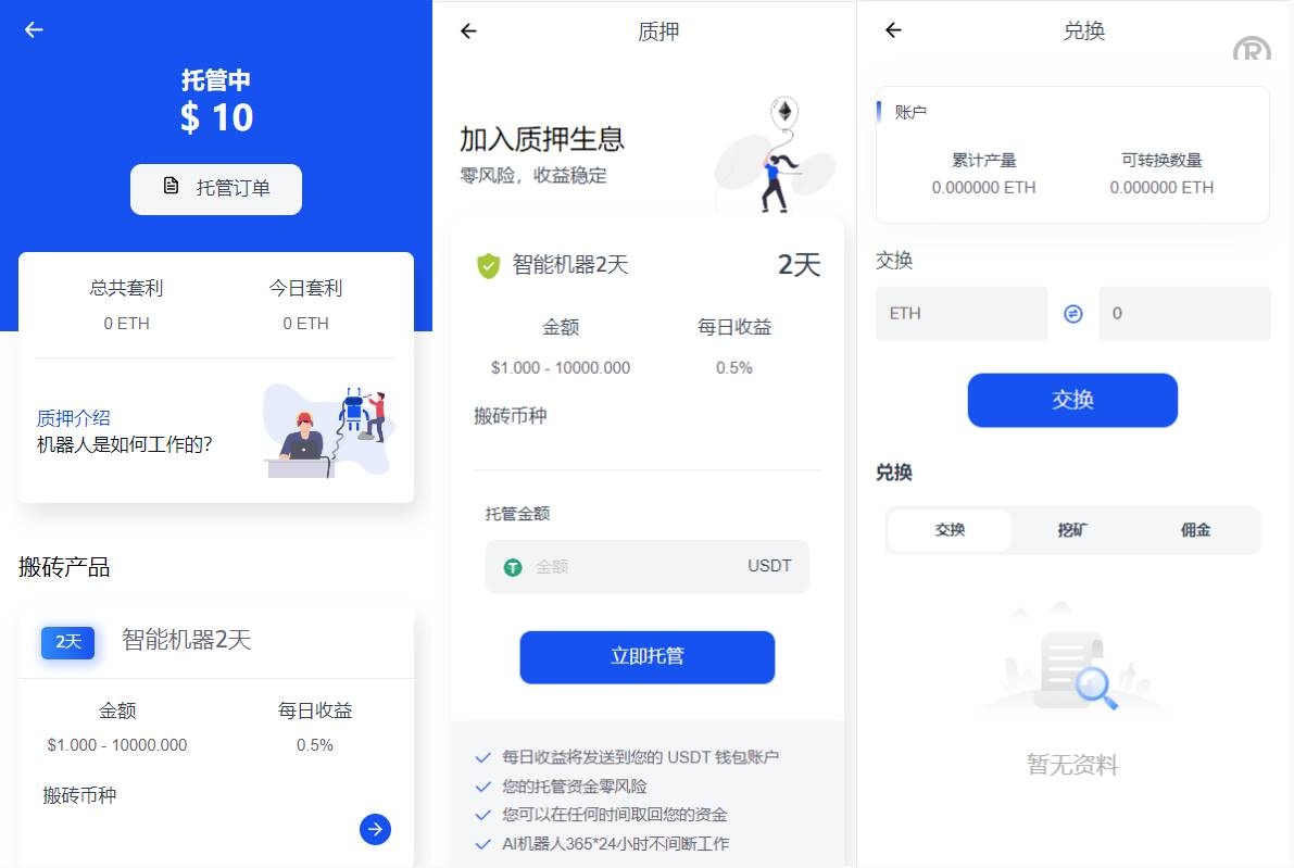 1、二开矿池的功能,用户参与挖矿,参与的用户根据1~4999 USDT, 1.00%、5000~19999 USDT, 1.30%、20000~49999 USDT, 1.60%、50000~99999 USDT, 2.00%、100000~299999 USDT, 2.50%、300000~2000000 USDT, 3.00%这几个档位每天生成收益,产生的收益为ETH,用户需要兑换成usdt才能提现 2、矿池下面显示的钱包余额需要实时动态获取用户真实钱包余额