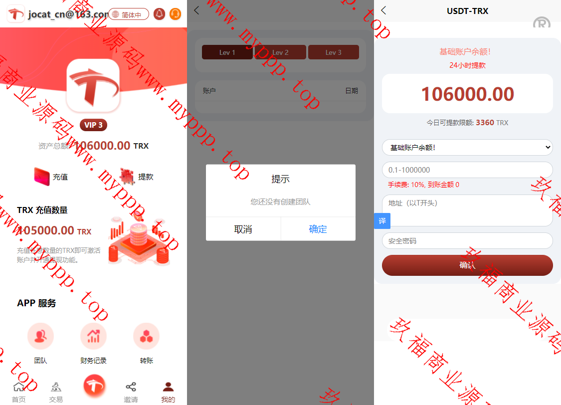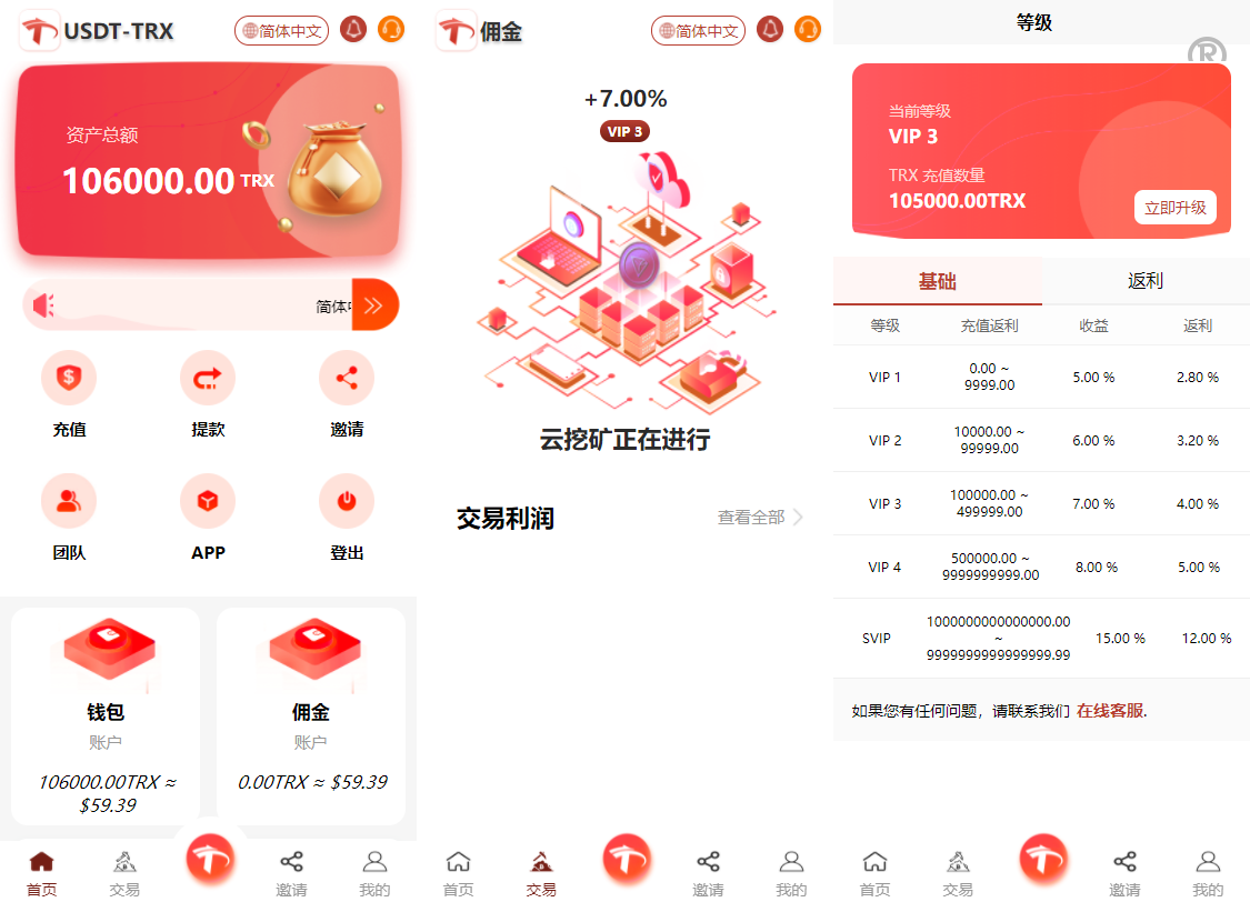 2. 注册成功后,会送1000体验金额,如果是通过验证码注册的三级都会有注册收益,后台系统设置里可以置注册后送多少体验金,vip1每日有收益5%,vip2收益6%,根据你充值的金额超过一定的数量自动升级vip,但是这些收益不能提现,要用户充值24小时后才能提现,提现的金额是累计充值金额*提币率比如他累计充值了100元提比率是2.8%,那么他可以提现2.8元。