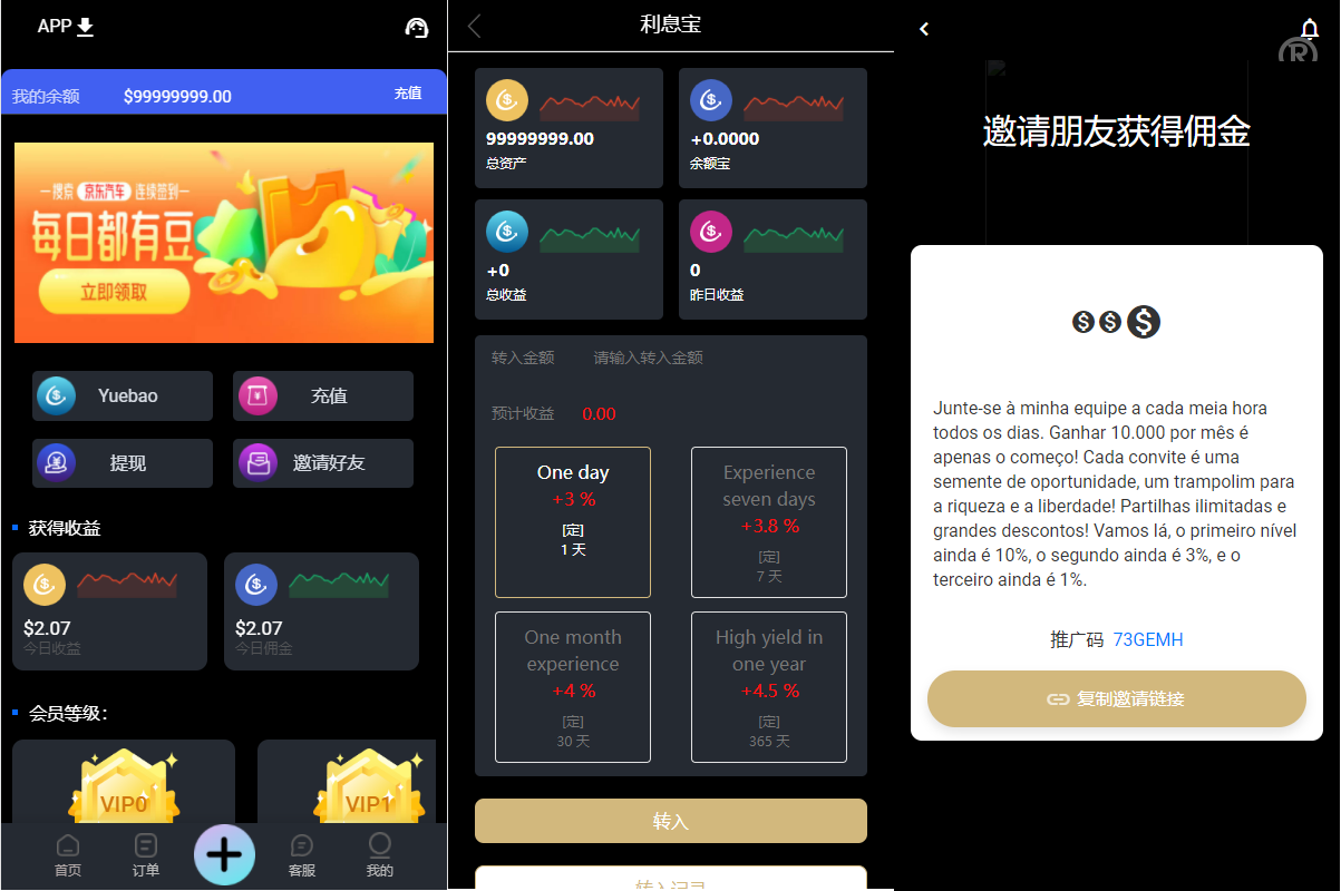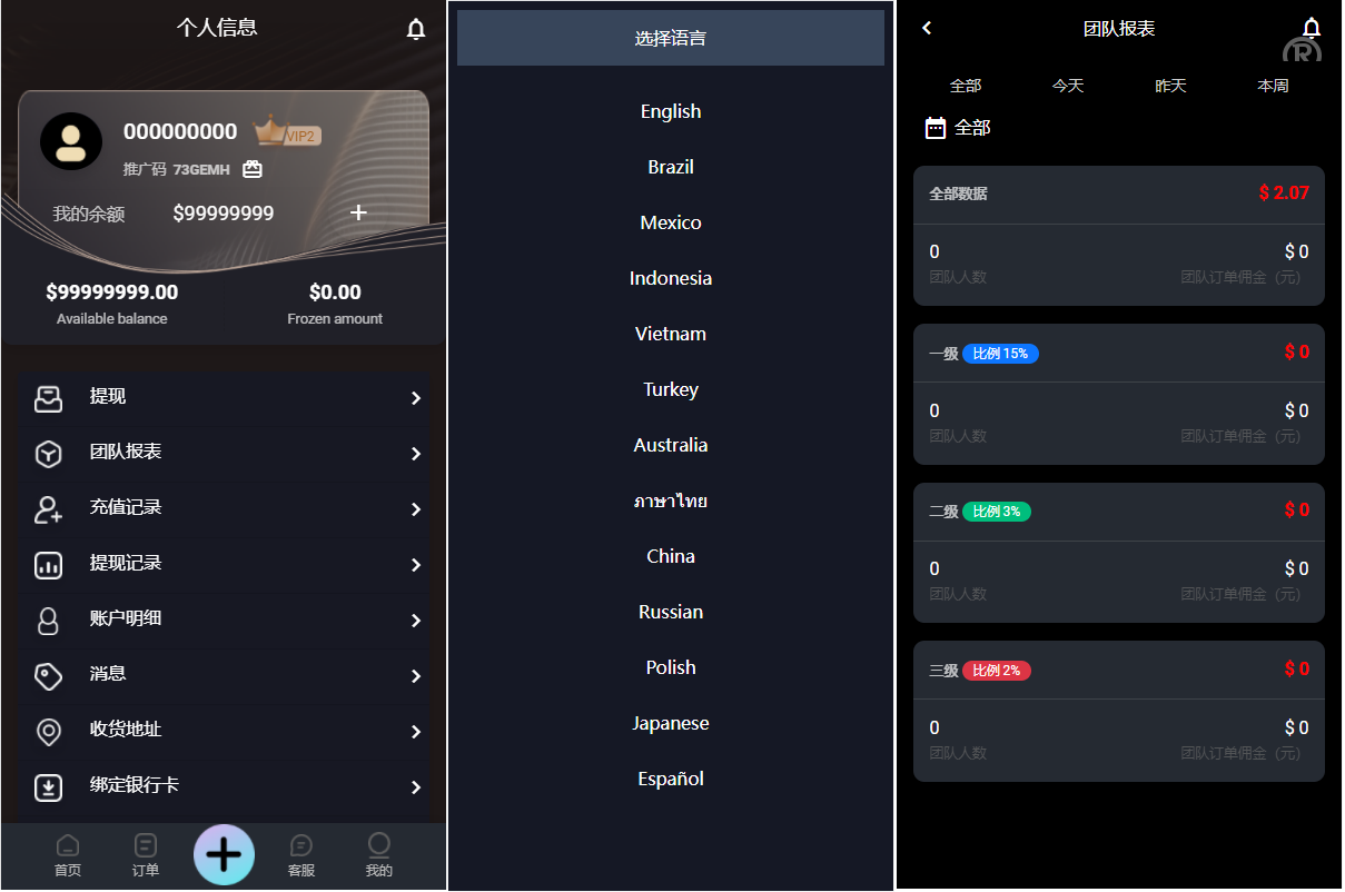 支持多国语言切换,已对接多国几十种支付接口!时区设置,代理多客服切换,余额宝 多分销 分佣模式,体验金设置,级别任务设置 等等更多火热功能!