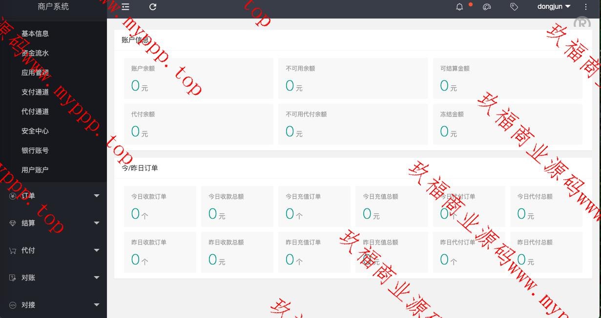 运营后台,功能包括商户管理,代理商管理,订单管理,支付配置,结算管理,代付管理,数据分析,对账管理,系统管理。