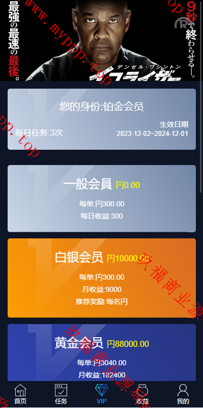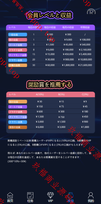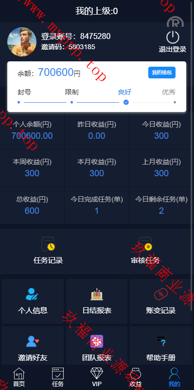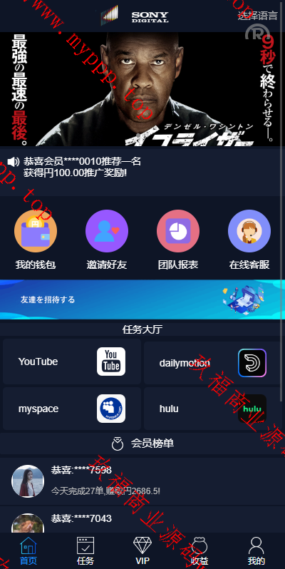 玩法简介:会员通过购买套餐进行升级。领取任务后,观看视频时间到达时订单自动完成。会员可分享邀请链接,邀请好友注册后将获得提成奖励。