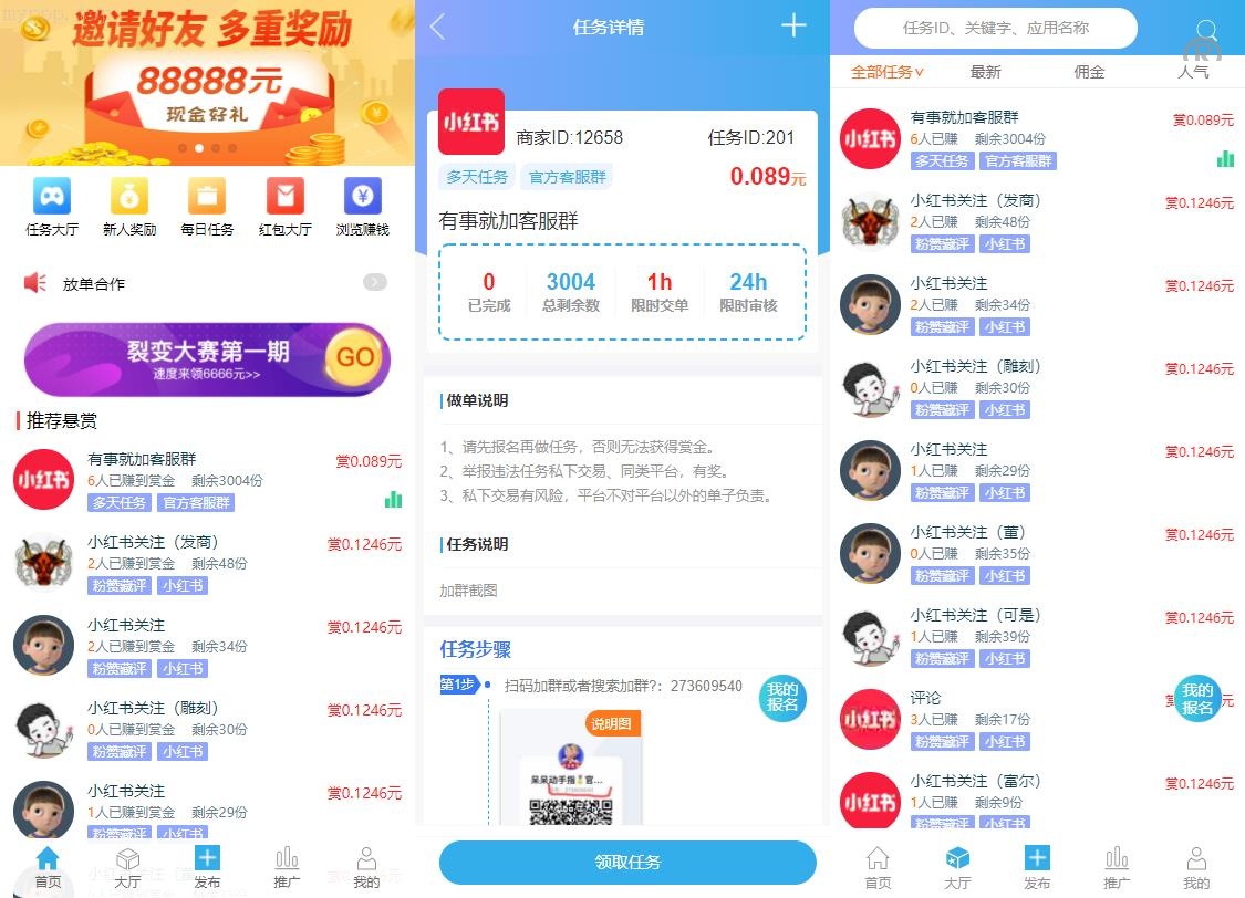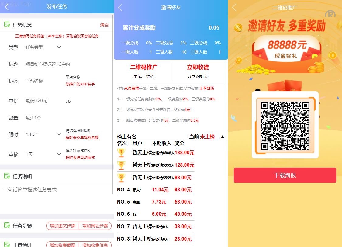 全新开发的悬赏任务兼职系统,仿蚂蚁帮扶众人帮平台,功能全面,包括接单、发布任务、店铺关注、置顶推荐、排行榜、红包大厅、红包抽奖、任务步骤、微信绑定、分销推广、举报维权、VIP会员特权等众多功能。已有客户成功上线运营,支持微信绑定登录,并附带APP推广页面。