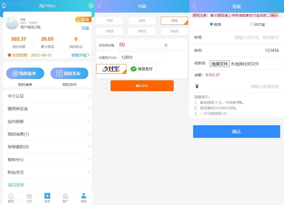 2、任务置顶、VIP会员体系、我的店铺、关注分类、分红机制及微信登录功能。